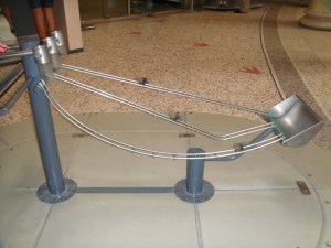 Three balls are released at the same time. The track furthest from the camera has a steady downhill grade, the middle one has a steeper grade with an uphill finish. The track closest to the camera drops immediately and then curves upwards towards the finish line. As you can may be able to discern the ball on the track closest to the camera is clearly in the lead. It gains so much momentum in the first second that the balls on the other tracks have no chance to recover from their slower starts.
