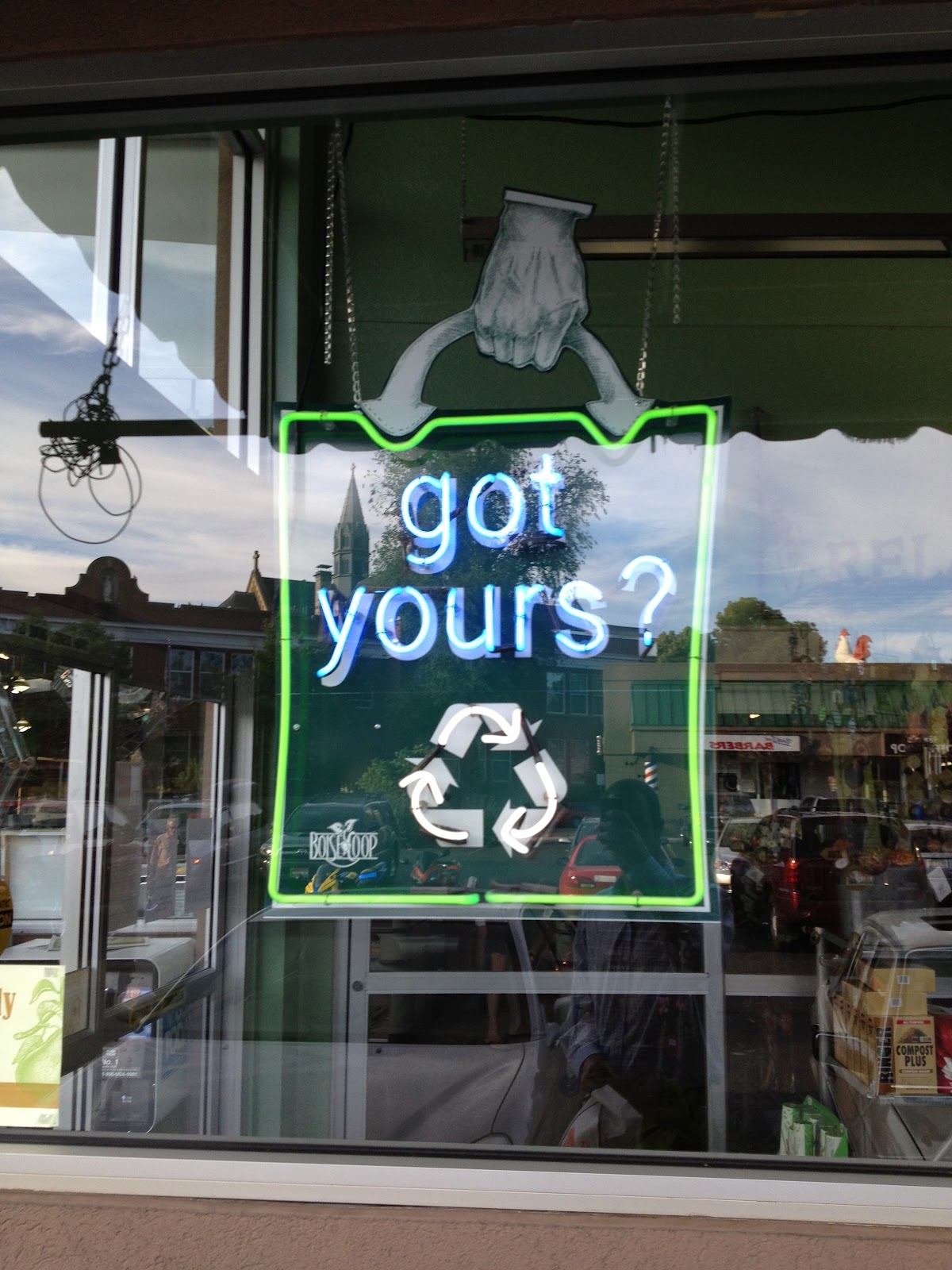 Reminder What are the obvious steps you can take to encourage a habit? I have walked a few steps from my car or bike and been reminded the bring my bag into the store thanks to this sign.