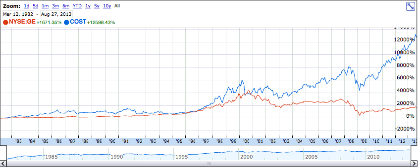 General Electric was the classic model of a company that would let go of the bottom 20% of its employees on an annual basis. If you did not perform, you did not stay. This created a very competitive environment but also one in which trust, innovation, and risk were not worth building. Contrast this with Costco, a company that pays a living wage and invests in its people. The Circle of Safety extends to the edges. The investment community would suggest that GE practices the hard-hitting principles that make for strong quarterly results. However, Costco has actually outperformed GE over long-run (see chart below), providing a blueprint that treating the employees as something other than a commodity is possible and prosperous.