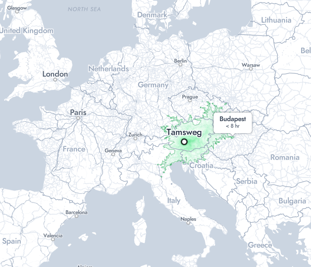 Where we originate our trip matters if travel time is a priority. The map above shows all the places one can travel to via train in 8 hours or less when departing Geneva, Switzerland. Check out the mapping tool here.